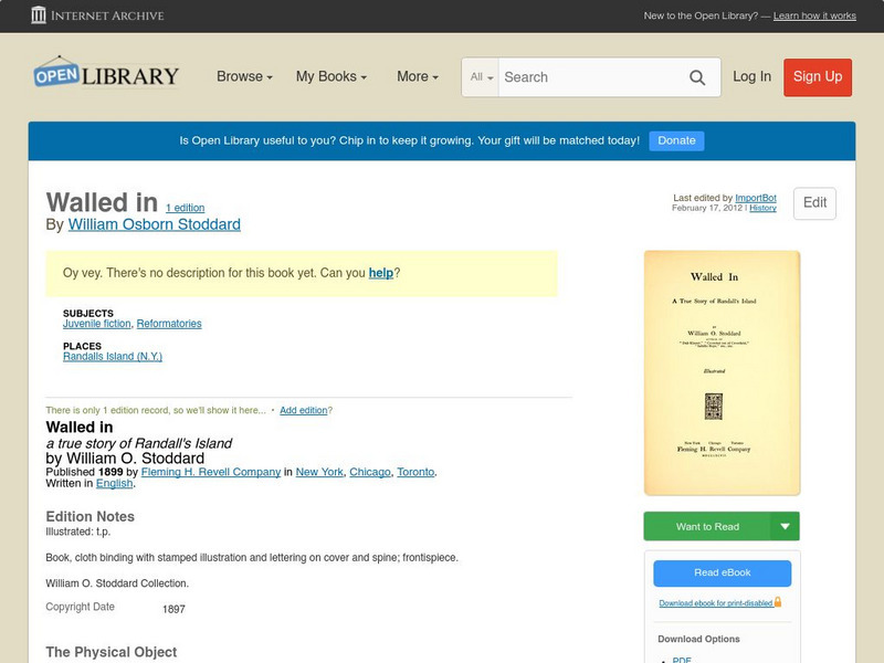 This ebook version of William Osborn Stoddard's Walled In has been made available in multiple formats by the Open Library. Editions of the full novel, organized by year of publication, may be accessed here.
