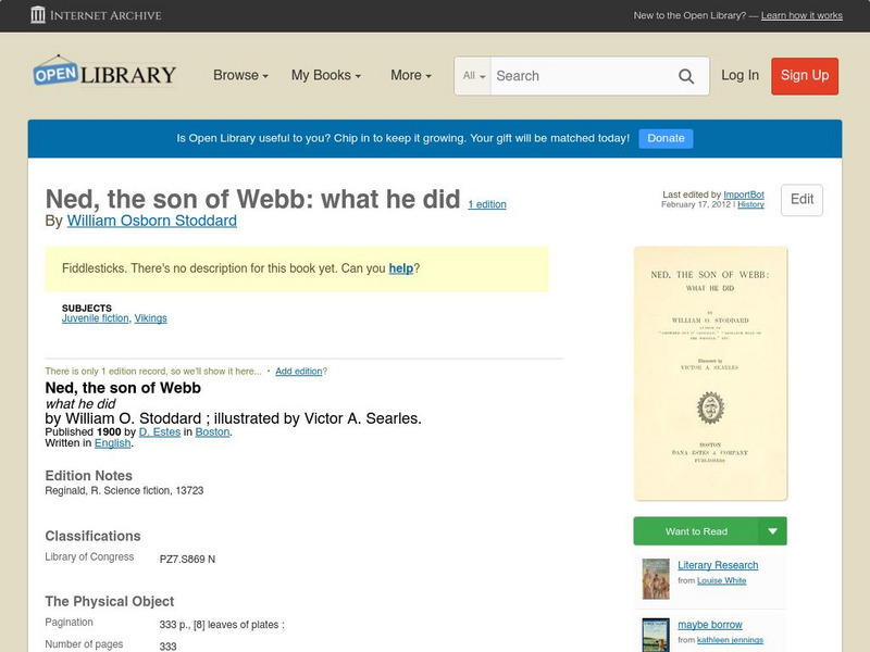 This ebook version of William Osborn Stoddard's Ned, The Son Of Webb: What He Did has been made available in multiple formats by the Open Library. Editions of the full novel, organized by year of publication, may be accessed here.