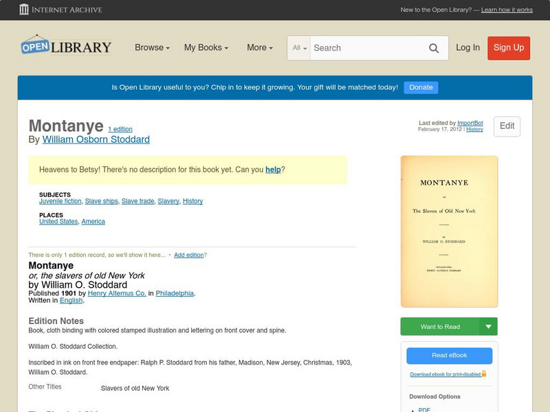 This ebook version of William Osborn Stoddard's Montanye has been made available in multiple formats by the Open Library. Editions of the full novel, organized by year of publication, may be accessed here.