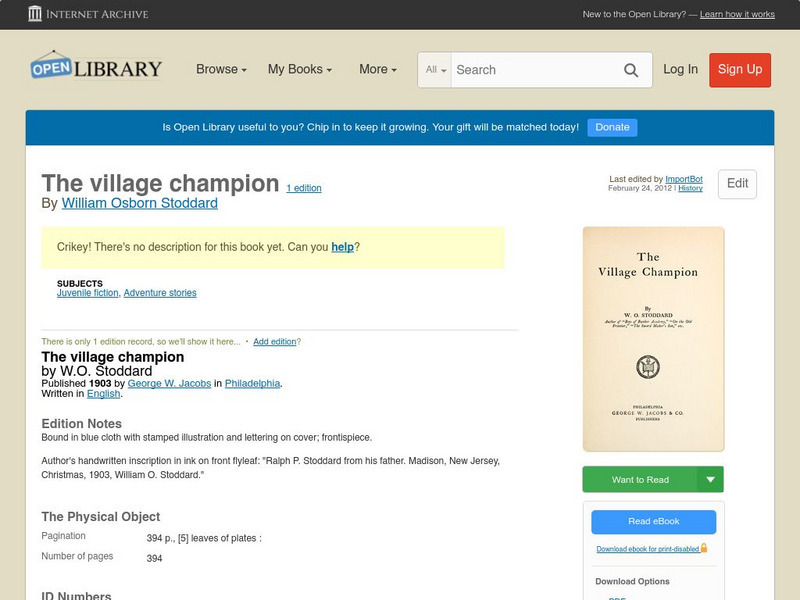 This ebook version of William Osborn Stoddard's The Village Champion has been made available in multiple formats by the Open Library. Editions of the full novel, organized by year of publication, may be accessed here.