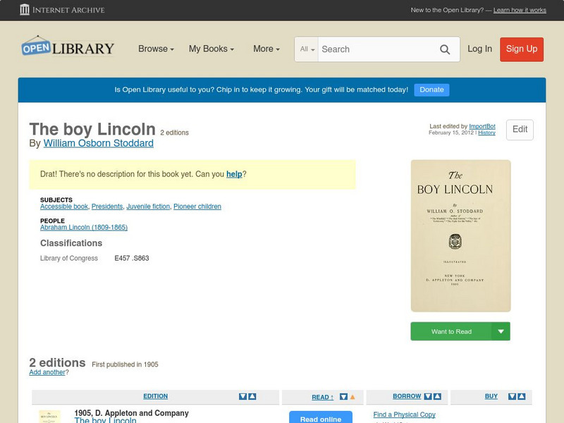 This ebook version of William Osborn Stoddard's The Boy Lincoln has been made available in multiple formats by the Open Library. Editions of the full novel, organized by year of publication, may be accessed here.