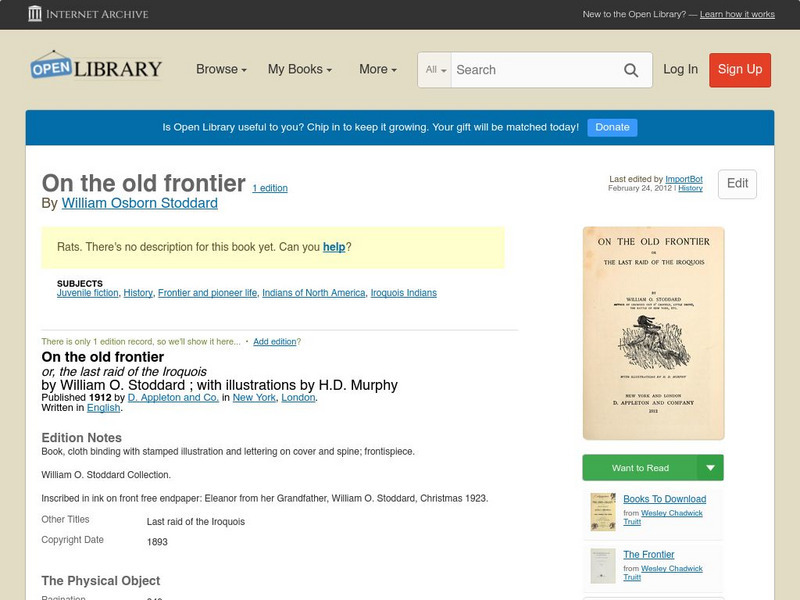 This ebook version of William Osborn Stoddard's On The Old Frontier has been made available in multiple formats by the Open Library. Editions of the full novel, organized by year of publication, may be accessed here.