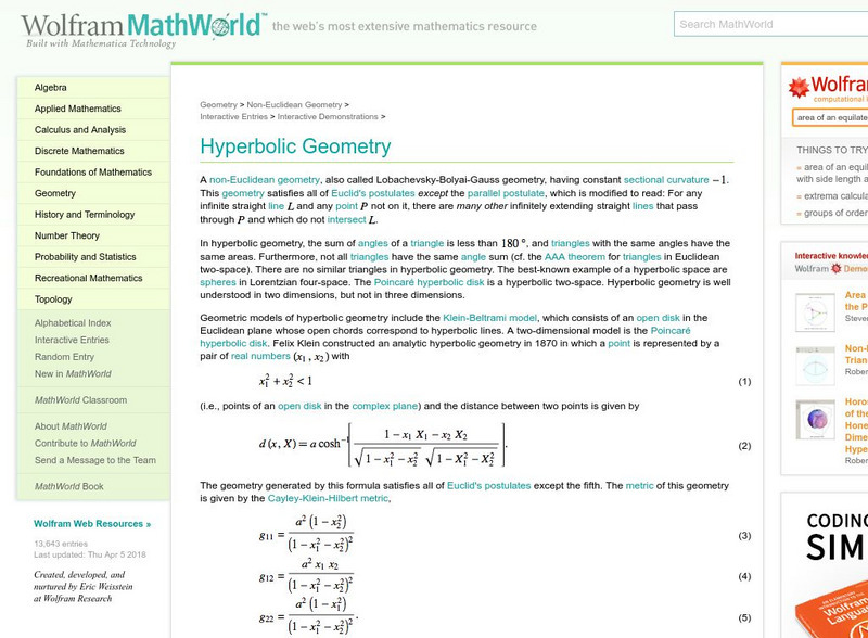 This encyclopedia entry from Wikipedia offers a discussion on hyperbolic geometry. The site explains how the hyperbolic geometry plane is represented in two dimensions and how lines in the plane must be drawn. Other types of models for...