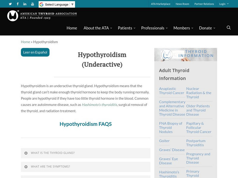 Visit this site for an overview on the condition of hypothyroidism. Read about the causes, risk factors, symptoms, how it can be treated, and complications that can occur. Also accompanying the article are numerous photos and diagrams.