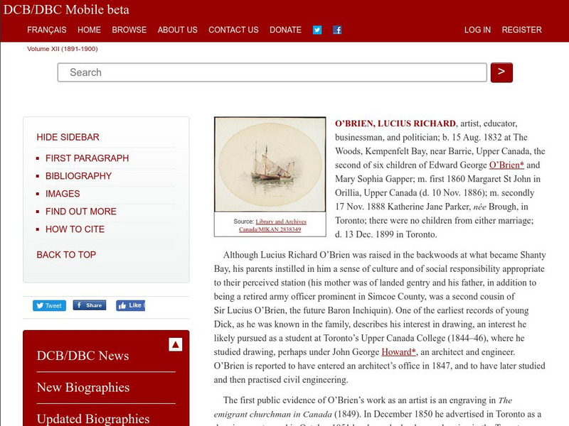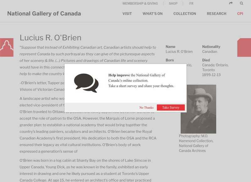 Presents detailed comprehensive information on Canadian artist and illustrator, Lucius O'Brien, who was the first president of the Royal Canadian Academy of Arts in 1880.