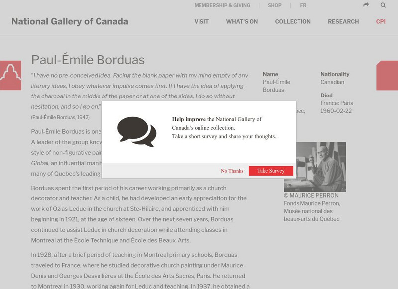 Good detailed biographical reference source on Paul-Emile Borduas, Canadian artist who became involved in the Montreal based art movement known as Automatisme.