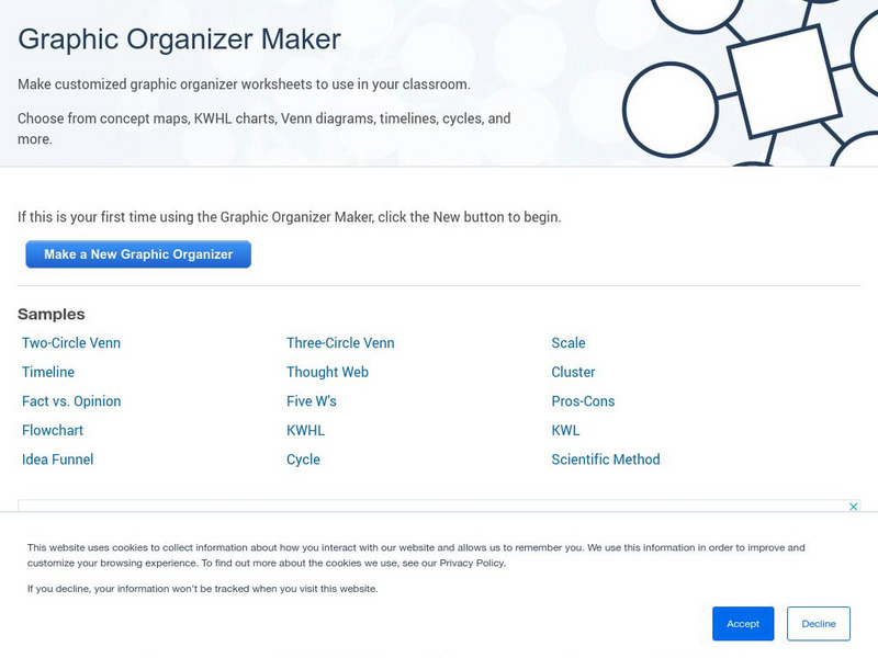 Tool for making customized graphic organizer worksheets to use in the classroom. Choose from concept maps, KWHL charts, Venn diagrams, timelines, cycles, and more.