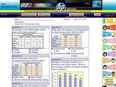 For this table worksheet, students read questions and interpret tables. Questions include information concerning unemployment, oil imports, and foreign students. This multiple-choice worksheet contains 10 problems. ...