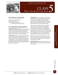 Students research where their favorite ingredients come from. In this ingredients lesson plan, students pick 2 ingredients and use the Internet to research where those ingredients originated from. Students then record their findings in a...