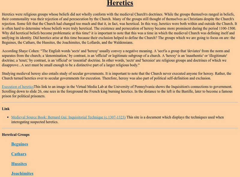 An overview of heretics and a link to the different heretical groups from a project designed by students at Kenyon College. Part of a larger examination of the marginality of groups in medieval Europe.