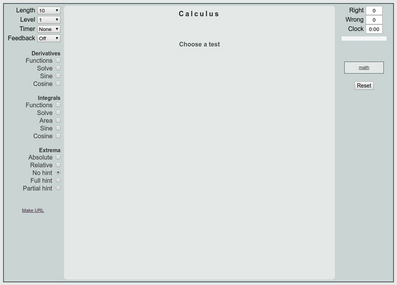 This interactive site is a great practice for derivatives and integrals. Ten different levels are provided and you can choose full hint or partial hint.