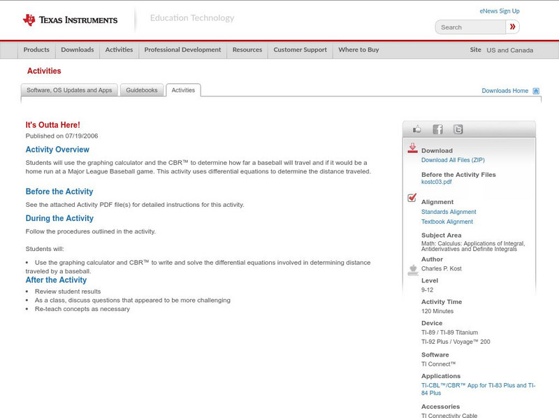This activity uses the graphing calculator and the CBR(tm) to determine how far a baseball will travel and if it would be a homerun at a Major League baseball game. This activity uses differential equations to determine the distance...