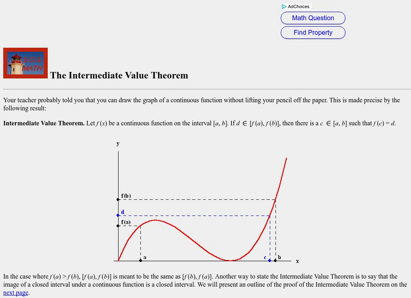 This site, from the Northeast Parallel Architectures Center at Syracuse University, explains the intermediate value theorem.