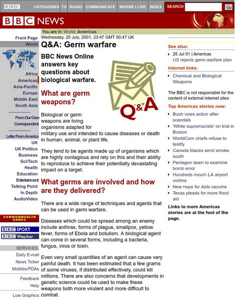 Read these questions and answers by BBC News Online about biological weapons, the threat of germ warfare, and the politics involved as of 2001. Includes many links to appropriate articles and related information.
