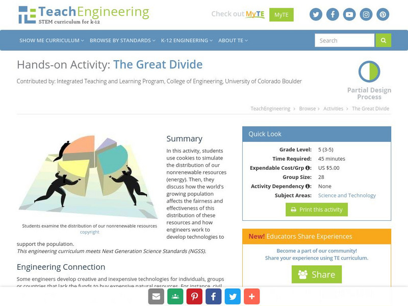 In this activity, students will use cookies to simulate the distribution of our nonrenewable resources (energy). Then, they will discuss how the world's growing population affects the fairness and effectiveness of this distribution of...