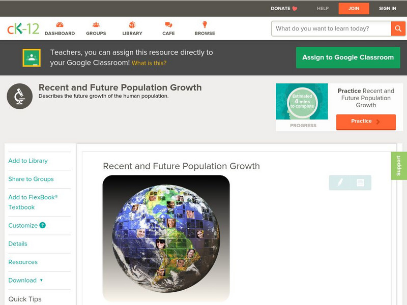 [Free Registration/Login may be required to access all resource tools.] Discusses recent human population growth and predictions of future population growth.