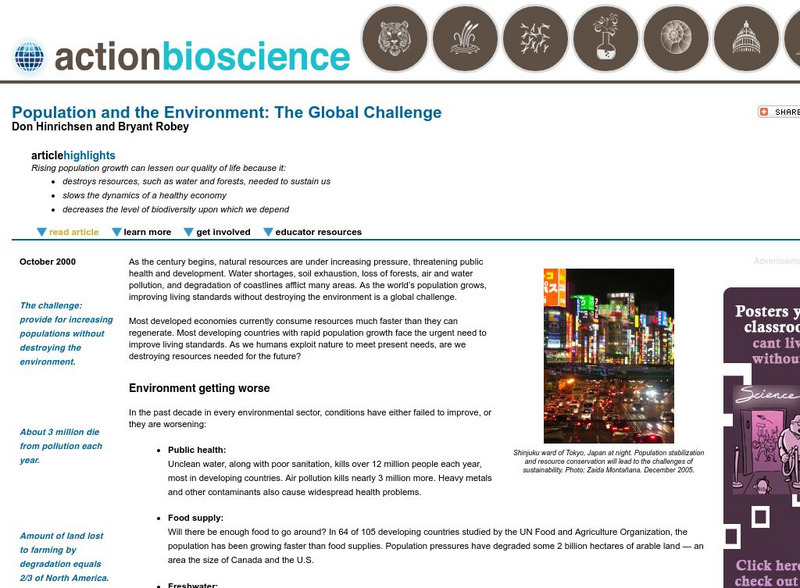 Look globally at the rising population and understand the impact on the environment, water supply, forestry, and biodiversity through the article and its supporting resources.