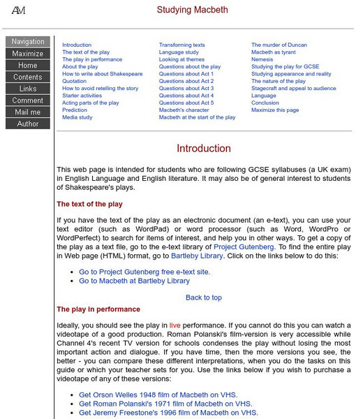 A site from the UK on William Shakespeare's Macbeth. Complete with information on the historical context, character analysis, thematic elements, and review questions.