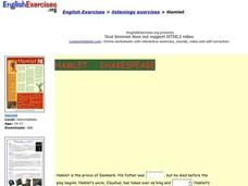 In this Hamlet worksheet, students watch a summary video about Hamlet and then fill in the blanks to paragraphs about it. Students fill in the blanks and complete multiple choice questions for 34 blanks.
