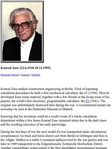 Biographical information about the engineer Konrad Zuse is provided at this site. Tells of his accomplishments and contribution to computer history.