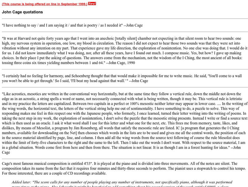 John Cage, the American minimalist composer, often made interesting commentaries on his music and culture in general. Here are some select examples of his remarks.