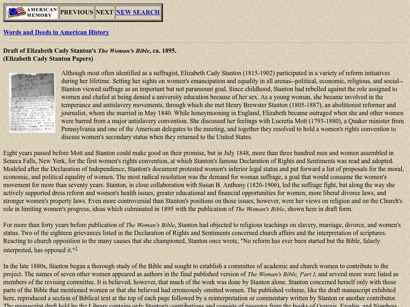 This site features a draft of Elizabeth Cady Stanton's The Woman's Bible and summarizing text from Library of Congress.