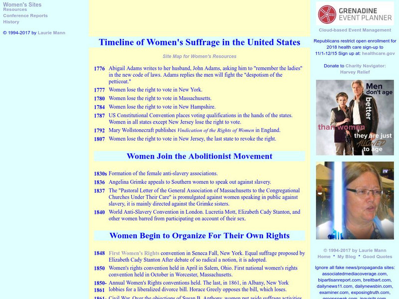 This site contains a detailed timeline of events relating to women's rights and suffrage from 1776 to the passing of the 19th Amendment. Link to Elizabeth Cady Stanton's Declaration of Rights and Sentiments.
