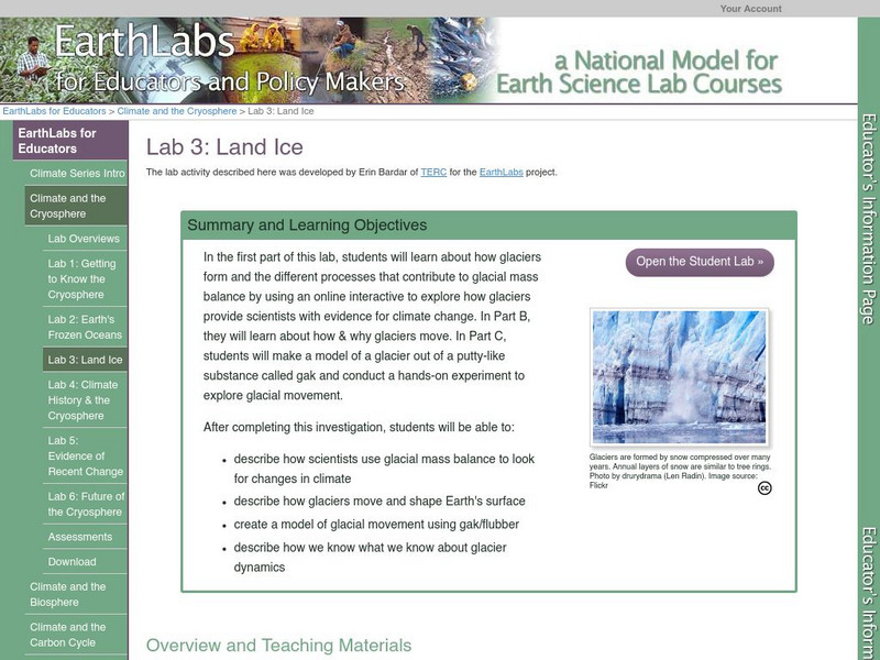 A lab experiment in a series of experiments that investigates climate and the cryosphere. Here you can learn about how glaciers form. Understand how glaciers offers scientist evidence for climate change. Lab includes both an online...