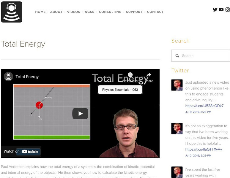 In the following video Paul Andersen explains how the total energy of a system is the combination of kinetic, potential and internal energy of the objects. He then shows you how to calculate the kinetic energy, gravitational potential...