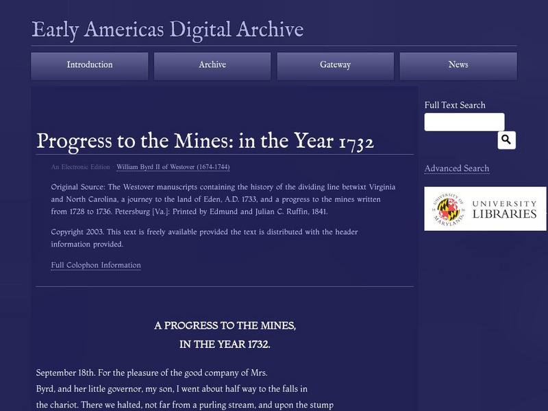 The complete text of "Progress to the Mines: in the Year 1732" by William Byrd II.