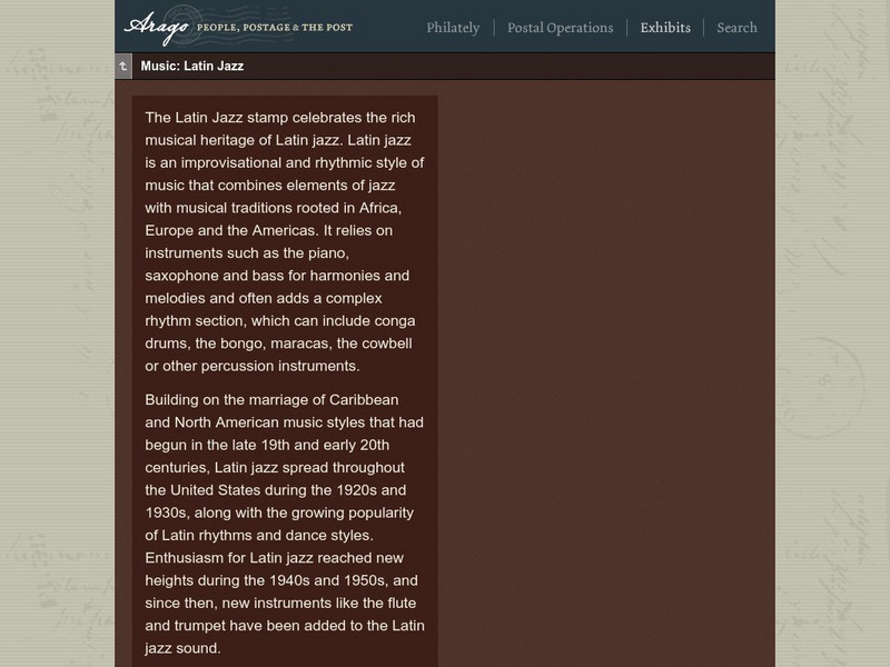 Learn about key aspects of Latin jazz from this captioned exhibit of a stamp issued in 2008 to celebrate it.