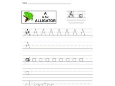 For this printing letter a worksheet, students trace 20 dotted examples of upper and lower case Zaner-Bloser letter a. Students then use the blank primary lines to practice their own letters.