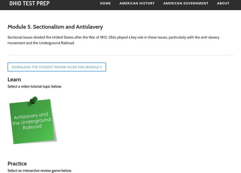 Ohio Social Studies test preparatory module informs about the anti-slavery movement, the Underground Railroad and the key role Ohio played during this era. Site includes video tutorial, interactive practice material, and assessment.