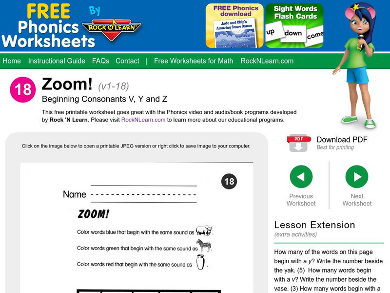 This printable consonant letter worksheet from Rock 'N Learn can be used as a reinforcement activity or as an assessment. Students will look at a picture with multiple items and then identify each item that start with /v/, /y/, and /z/....