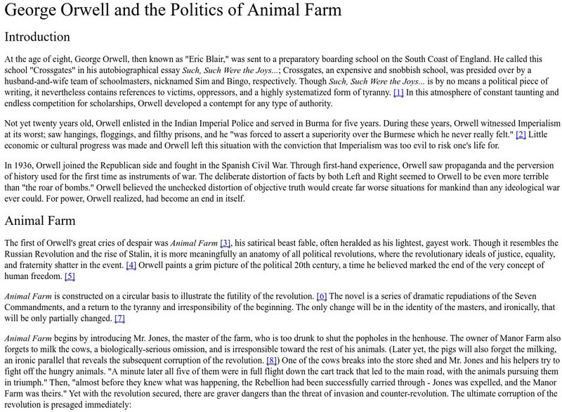 This is Paul Eissen's analysis "George Orwell and the Politics of Animal Farm." It includes a short biography of Orwell, a discussion of Animal Farm and revolution, a conclusion, and notes.