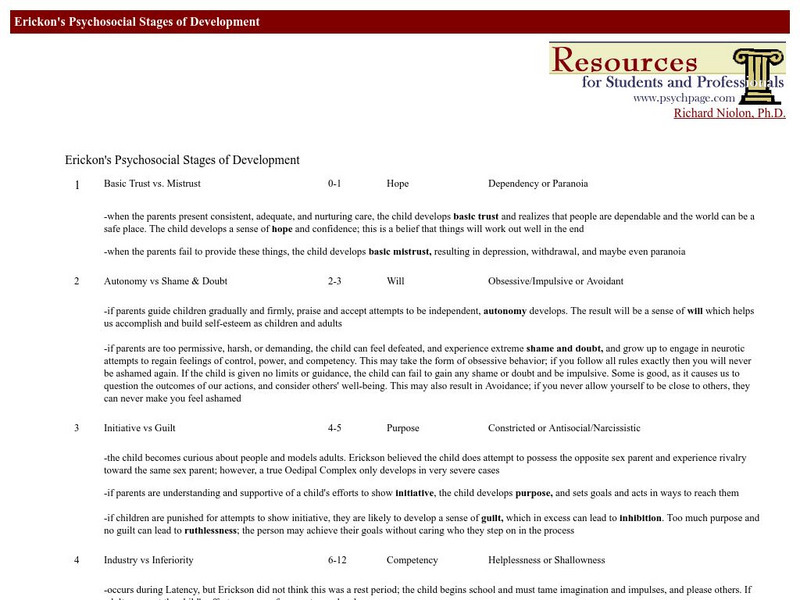 Psychology: Kendra Cherry: Erikson's Psychosocial Stages Summary Chart
