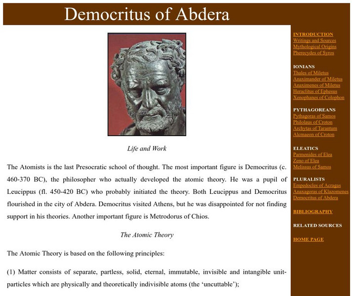 A discussion of the theories of Democritus (c. 460-370 BC). He is best known as an atomist, having developed an atomic theory. Also discusses the ideas of other philosophers who are believed to have influenced Democritus.