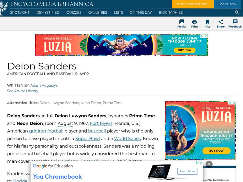 This entry from Encyclopedia Britannica features Deion Sanders, an American gridiron football player and baseball player who is the only person to have played in both a Super Bowl and a World Series. Known for his flashy personality and...
