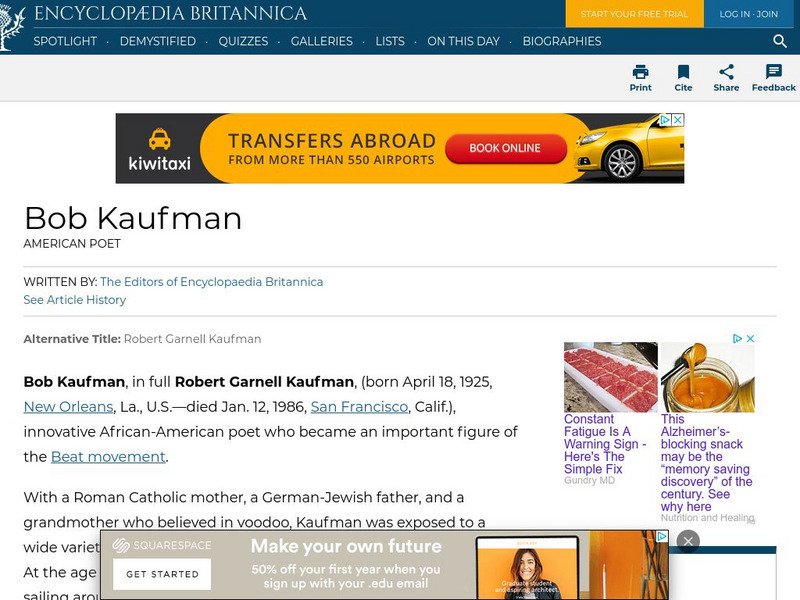 A brief biographical overview of Bob Kaufman including information on his life and links to selected poems. A column of links to additional reading information on Kaufman is also provided.