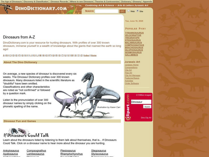 This site is a must for learning about dinosaurs. It profiles over 300 known species. It also lets you hear how to pronounce the name.