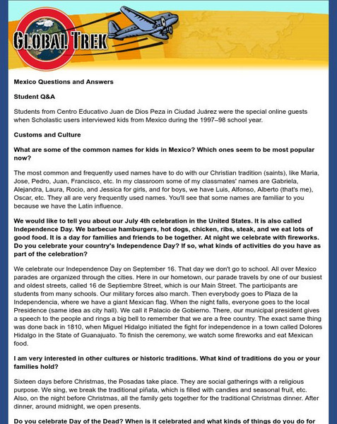 Students in Mexico answer questions about their lives, comparing their experiences to those of American children. They talk about popular names, celebrations, food, geography, social and environmental issues, the economy, history,...