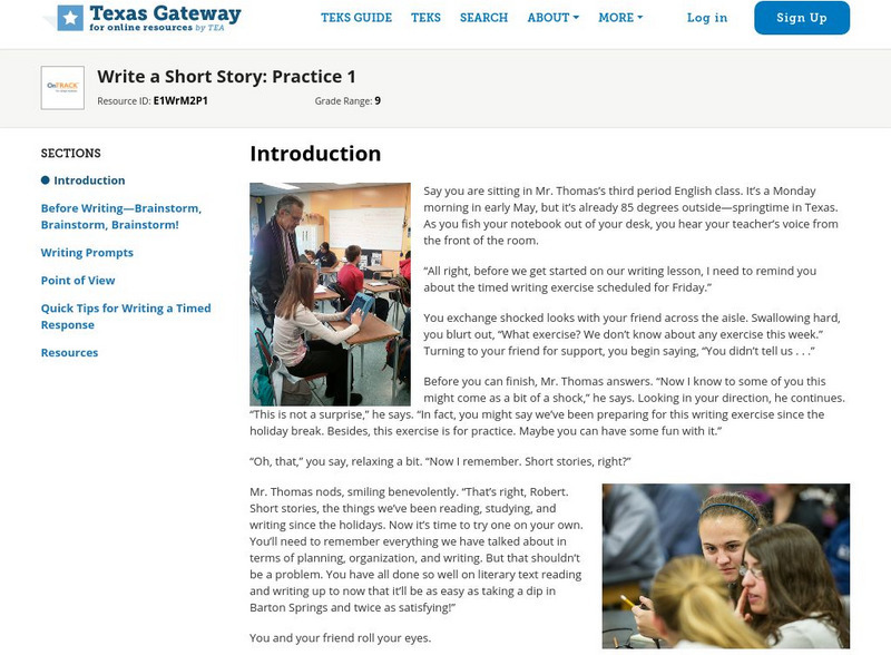 A learning module that gives students practice writing a short story in four lessons: Introduction; Before Writing-Brainstorm, Brainstorm, Brainstorm; Writing Prompts; Point of View; and Quick Tips for Writing a Timed Response.