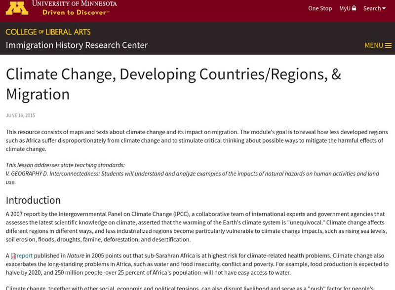 This resource consists of maps and texts about climate change and its impact on migration. The module's goal is to reveal how less developed regions such as Africa suffer disproportionately from climate change and to stimulate critical...