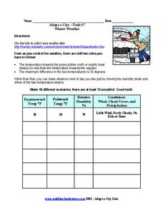 In weather worksheet, students use an on line site to collect weather data. They create 10 different weather scenarios using a temperature and humidity slider. They includethe temperature, relative humidity and weather conditions and...