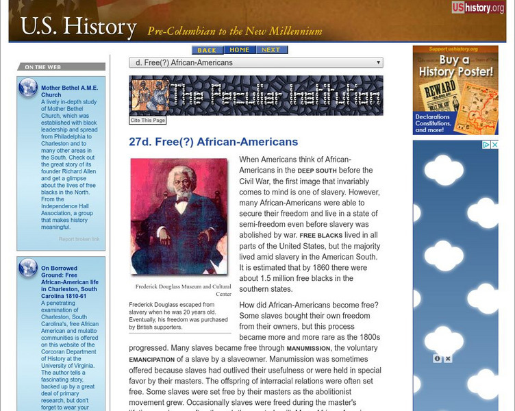 Not all African-Americans were slaves in the South. Some were freed by their owners, others escaped, but none had the same rights as free whites. Read about their restrictions that were put into law. Find out about the church...