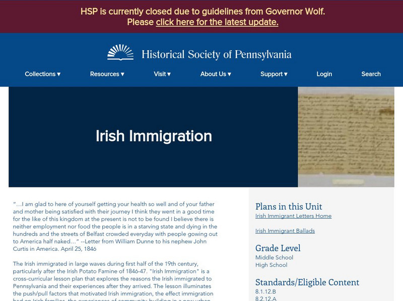 Cross-curricular plan for lessons on the immigration of the Irish to America in the 1800s. Source material includes ballads of the immigrant experience, letters, scrapbook pages and notices to the 'Catholic Herald' seeking information...