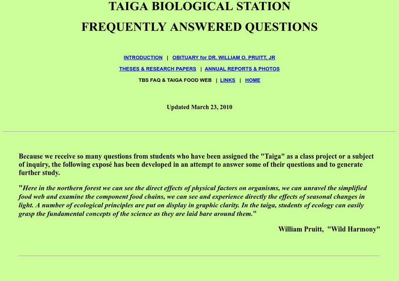 As part of a virtual museum exhibit, this site explores the taiga biome. Here you can learn what a taiga biome is, where you can find it, and the types of plants and animals that live there.