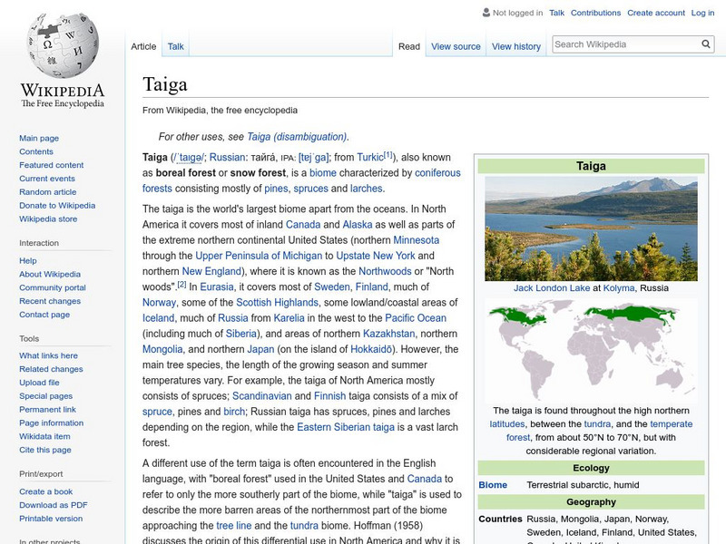 Wikipedia, an open-source encyclopedia, offers a general overview of the taiga biome. A long list of taiga eco-regions can be found, each linking to its own encyclopedia entry.