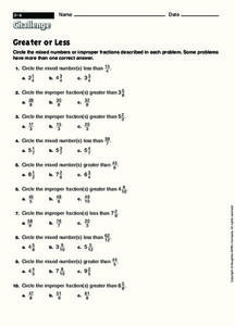 In this comparing mixed numbers worksheet, students respond to 10 problems that require them to compare the values of mixed numbers and improper fractions.
