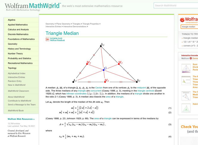 MathWorld provides an example and explanation for the median of a triangle. Lines A1M1, A2M2, and A3M3 are the medians of triangle A1A2A3.